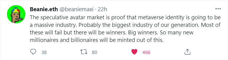 Don’t take it from me though, this is a Tweet from one of the biggest NFT influencers in the world on the importance of digital avatars: